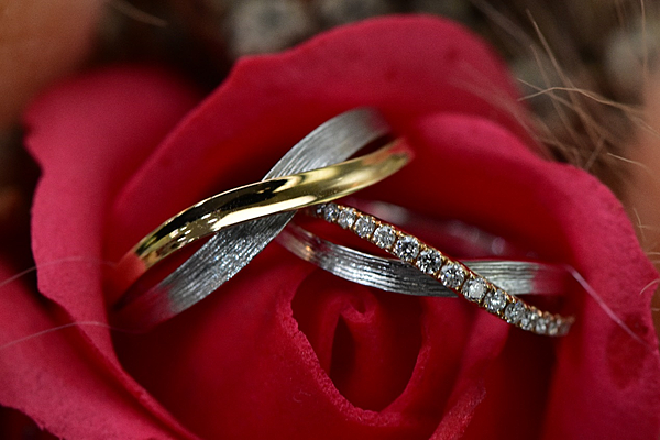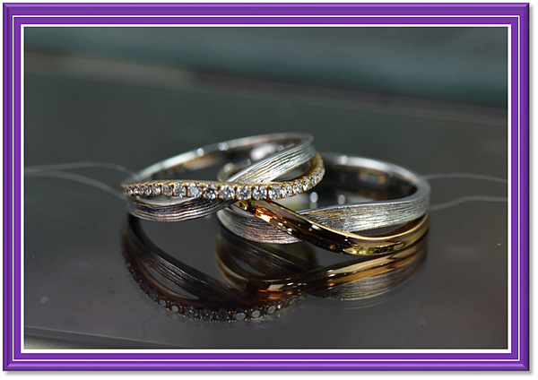 再來要推薦的第二款情侶對戒,在戒身設計上有個小巧思,利用交叉的線條製造出一個無限符號,祝福情侶們可以長長久久!銀色的髮絲紋搭配K金金屬的設計多了些奢華感,鑲有一排小鑽的女戒,更深受許多女生的喜愛!像這樣多層次的對戒款式推薦給手指較纖細的女生,因為戒指有點份量可以幫單薄的手指加分,也因為有份量在男生的手上才撐得起來,是一款男女接受度都很高的情侶對戒,也是週年紀禮物的好選擇!